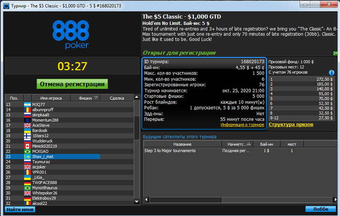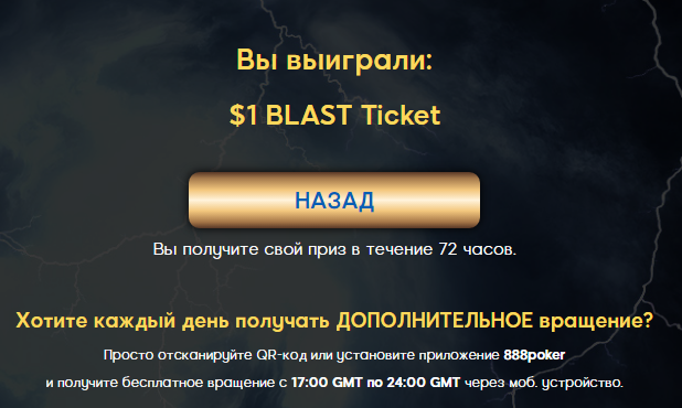Получилось чутка крутануться на 888 а все начиналось с фриролла при помощи чего я смог получить билет за 5$ который можно было реализовать в Blast или турнире, и все же я рискнул и пошёл в турнир рассчитывая на ИТМ зону и еле еле дотянул ну а вчера я немного подгрузил турниров и получилось малость крутануться.