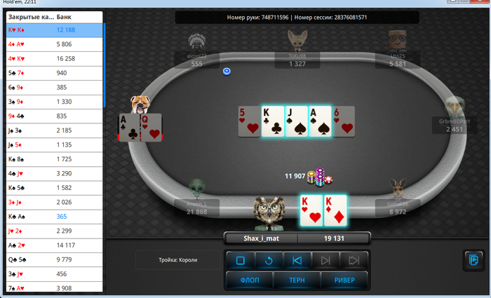 Всем доброй ночи. Ну что покатал сегодня просто жесть. Решил сегодня что бы догнать попробовать грузануть 4 FF стола + 10 Кэш столов. По итогу я вливаю 2 стека на 1 столе в течении 4 раздач одному оппу. Последнее выставление было вообще на постфлопе мультипот у меня 88<AK>A5 конечно ривером ложат К. После чего я закрываю FF столы и в дополнении включаю турниры на выстрел. Вообщем загрузка вышла в районе 17 $, ИТМ и 2 финалки дали плюс почти 28 $. Очень обидный куллер вышел на Финальном столе по 3 $