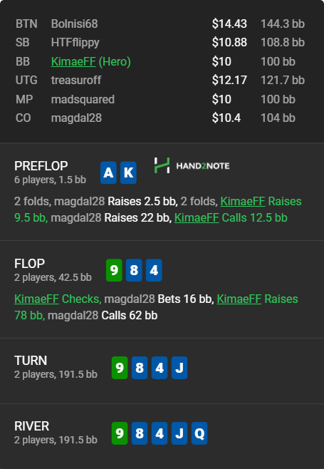 Итак рука очень похожа, что выкладывал несколько дней назад. Но тут я уже с большим удовольствием запихнул АКс, так как банк уже достаточно велик, а фолд эквити у меня полюбому есть. Да и еду я против некоторых рук очень даже не плохо, а с учетом мертвых денег и фолд эквити - то вообще все шикарно)