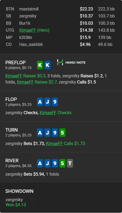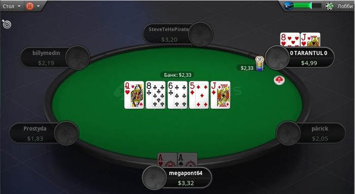 ребята, вот из сегодняшней катки. Сегодня играл Зум. Сразу скажу, что за сессию длиной чуть более часа получилось почти в два раза больше рук на трех Зум столах, чем на четырех "регулярных". Плюс еще "регулярки" постоянно менять надо, и бывает так, что играешь некоторое время три, а то и два стола.