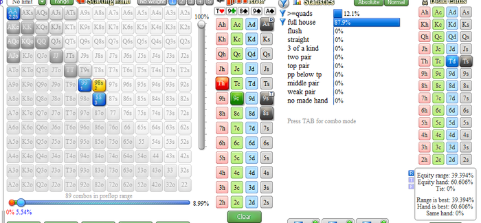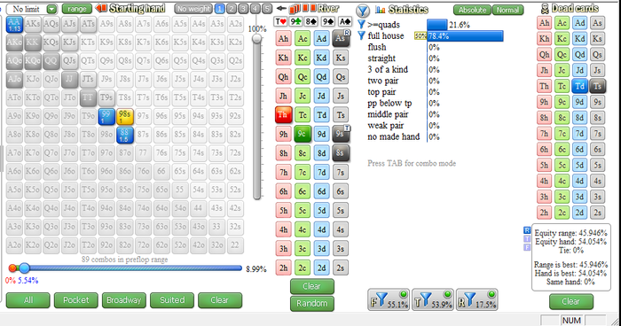 Трибетить будет, QJs на ривере не будет ставить , а вот за 89s я забыл . Прикинул эту раздачку во флопзиле Если опп так трибетит , то да , надо было пихать. Предположим , что 88 89s он заведет в 50% случаев, то все равно проходит пуш