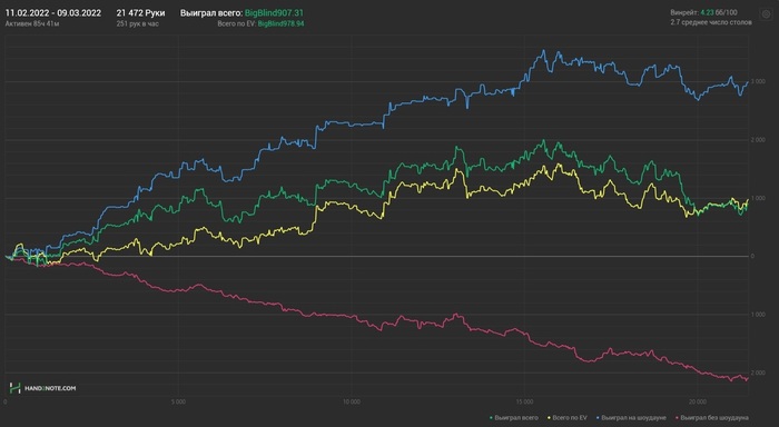 Последний отчёт был за февраль месяц, публиковал его 09.03.2022 К этому моменту я уже реализовал свои планы по вступлению в кеш фонд и начал адаптироваться к игре в приложениях. В настоящее время играю SH столы лимита NL100 c 5 EVBB/100. С момента последнего отчёта отыграл 57К рук.