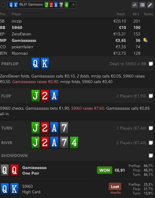 Я не думал, что он выкинет. Когда ставил, думал о том, что тузы там не обязательно есть (лимп-рейз префлоп). Карманки да бродвей. Просто... у меня-то тоже бродвей (пустая рука, считай).