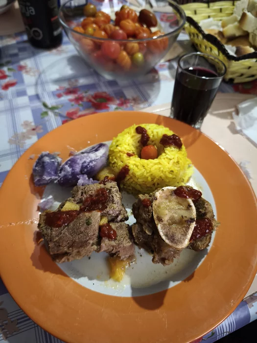 Всё кроме риса и вина - домашнее. Фиолетовое - это сорт картошки.