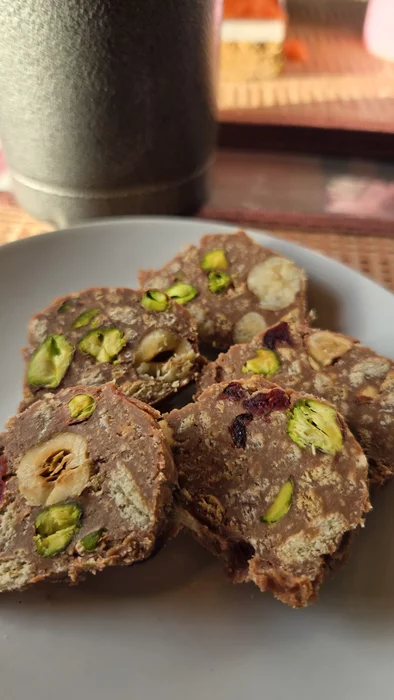 (смешать варёную сгущёнку, галеты, орехи, кефир - и в морозилку)