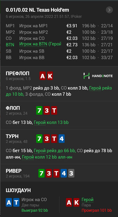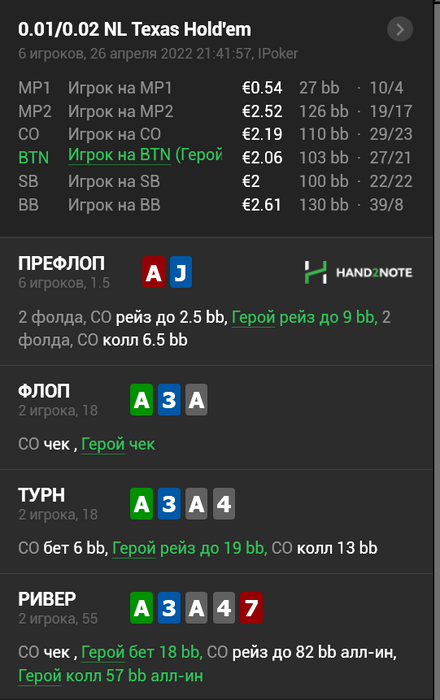 Твой чек на флопе на такой доске не нравится как и вся последующая раздача пошла кое как. . Возможно и можно так сыграть против агрессивного, но в большинстве случаев нужно добирать с топпар хуже, со средней пары, бекдоров, гатшотов и дро У тебя хорошая рука, которая особо ничего не блокирует из диапазона колла 3бета у оппа, (9T,98, 9J, QT, QJ, JT, Q9 и тд) Эквити диапазона у тебя и оппа примерно одинаковое. У тебя больше топпар. Всего остального(сетов, дро и тд одинаково) добирать 1/3 или 1/2 пота. и не давать бесплатных карт.