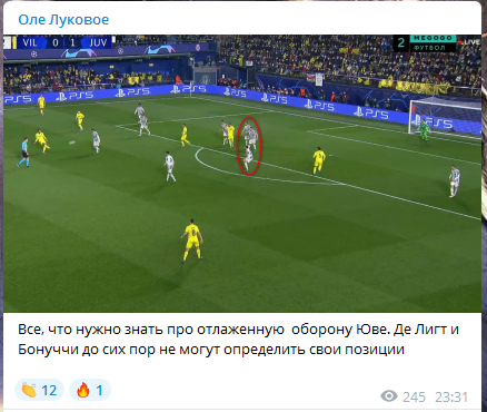 Именно на этом отрезке «Вильярреал» воспользовался едва ли не единственной ошибкой обороны «Ювентуса». Ло Сельсо начал смещаться из правого (для «Вильярреала») полуфланга штрафной сначала в центр, а потом (кажется, полностью оценив ситуацию, что можно еще больше расширить коридор для Парехо и увести Де Лигта) в левый полуфланг. И Де Лигт действительно ушел за Джио. Коридор образовался чуть раньше, когда Ло Сельсо с Де Лигтом сместились к центру штрафной. Де Шильо не мог сузить, так как следил за Чуквезе, располагавшимся широко. Но после того, как Ло Сельсо ушел левее тройка ЦЗ «Ювентуса» стала располагаться слишком близко друг к другу, коридор между Де Лигтом и Де Шильо стал огромным, а дальше Капу и Парехо сработали идеально. Это единственный явный момент в матче на две команды. Такую ошибку оборона «Ювентуса» допустила всего один раз, но этого хватило.