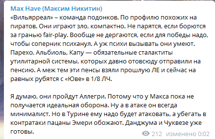 Вильярреал сегодня хорошенько обличил все уязвимые места Ювентуса. Субмарине пришлось сразу же покинуть зону комфорта после гола Влаховича, но это сыграло лишь на руку Эмери. Всегда считал Унаи достаточно разноплановым тренером, которого в самый ответственный момент может перемкнуть. Наверное, поэтому он и не входит в касту "элитных".