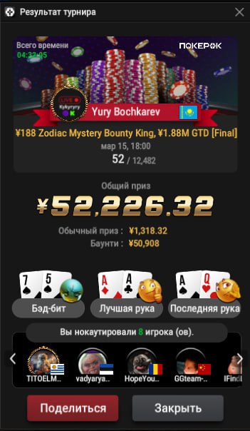 3. Разбор конкретного турнира - 150$ (2 часа). Вместе разберем лог твоего турнира, турнир желательно с хорошим проходом, чтобы разобрать все стадии, включая ICM