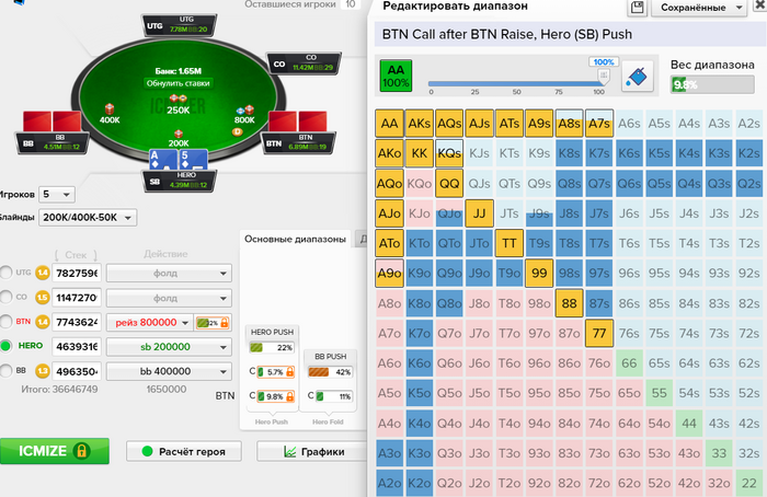 6. Стоит в банке уже 11бб, а это около 40% от нашего стека, вот только нужно посчитать частоту фолдов для пуша , тут было исключительно на интуиции,а она конечна не всегда надежна)