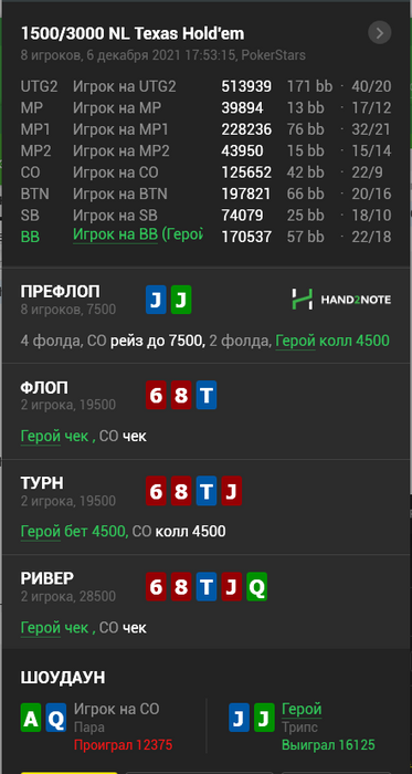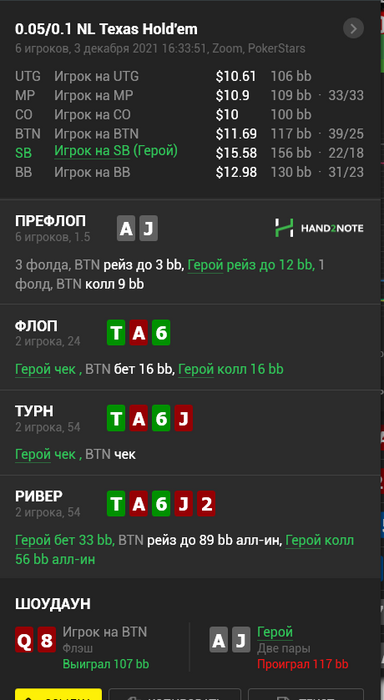 Промежуточные итоги турнира. Уже в призах,стек выше среднего. Не знаю был ли у меня добор ривером, ренж опа 10 + но после чека флопа положил на AJ-AQ ,AK