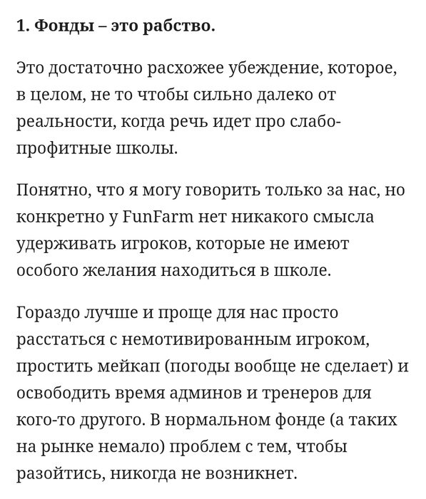 Более того, фонд ловили на прямом искажении фактов, и сама позиция фонда как минимум за этот пост 2 раза кардинально поменялась от игрок отыграл первый контракт и не может разорвать второй так как это противоречит духу соглашения, до первый контракт не отыгран - игрок должен доиграть. Позиция игрока же выглядит как непротиворечивая, и на мой взгляд фонд не смог предъявить ни одного убедительного доказательства своей правоты.
