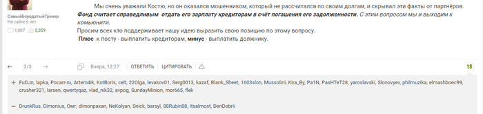 То что тут творится это какой то наркотический бред. Обидки фонда превращаются в суд линча. Кто из комюнити поддерживает это? Теперь что, любые деньги которые кто-то должен кому-то будем раскидывать потенциальным кредиторам этих людей? Кто их будет находить? Кто удостоверится в правильности расчетов? И эту ВСЕЛЕНСКУЮ ХУЕТУ я читаю на форуме где бекали Чопа, где один из учредителей в долгах уже десятки лет. Где в фонды сотрудниками брали людей с арбитражами.