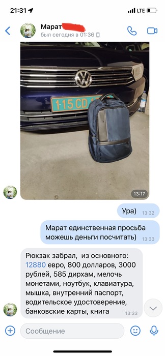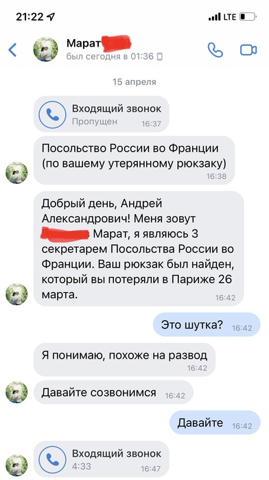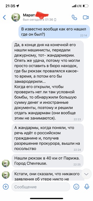 Первые мысли были что какой то тип прочитав мой пост решил таким образом потролить, но… это было чудо, человек был реально из посольства России во Франции, мы созвонились….когда он назвал мои паспортные данные, данные моих прав, в животе резко заиграли бабочки, хотелось закричать, но уже через несколько секунд эйфория спала…он сказал что ваш рюкзак найден, но сейчас он находится в полиции Франции и жандармы отправили в посольство России сканы моего паспорта, чтобы те искали хозяина. Это были приятные новости, но что осталось внутри было не известно, но они ему передали что в Нутри были деньги но, не указывали сколько.