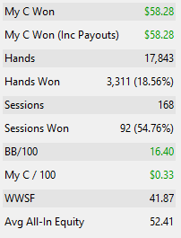 День 23. 3000 рук 3 сессии 4 рег стола и недобор 7БИ -1,7$ . С сундука +2$ Баланс 136,25$