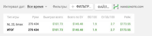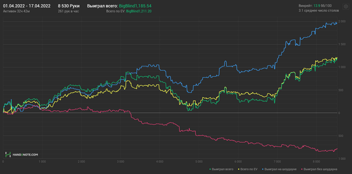 Так вышло покатать на рег столиках, причем были мысли плотно гриндить по 10+ столиков. Но быстро от этого отошел. Фактический плюс вышел 12,5$, около 4бб/100 короче с рейком 7,34бб.