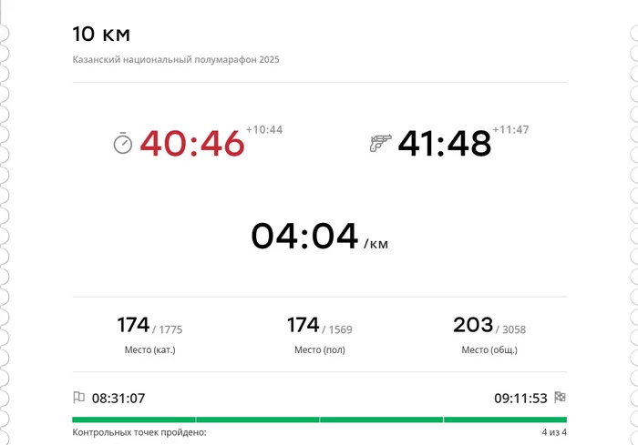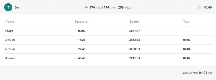 Доволен раскладкой и итоговым временем. По ощущениям даже что-то ещё осталось в запасе. С трудом себя сдерживал на первой паре км, когда со всех сторон меня обгоняли. Но я сознательно шёл на это, пробуя хотя бы раз сбегать негативный сплит. Получилось. С третьего км и до финиша меня обогнала пара ребят, я обогнал 40-50 человек.