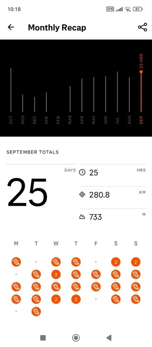 Этому тренировочному блоку ставлю твердые 9 баллов из 10. Обошлось почти без болей и травм. Было бы 10, если бы скинул по ходу дела еще 2-3 кг. За эти годы кажется нащупал беговые трен работы, которые дают прогресс без травм и выгорания. Так выглядел сентябрь, 280км объема