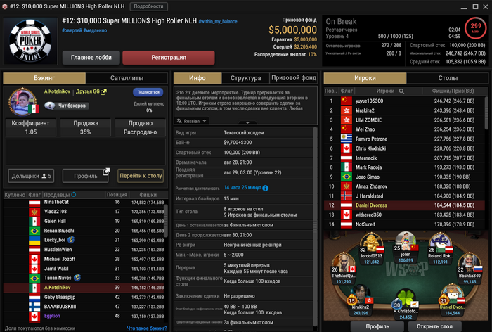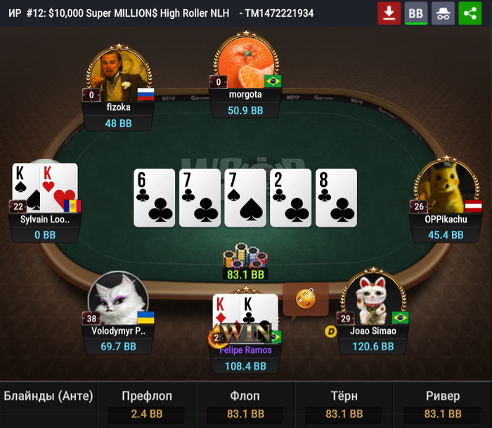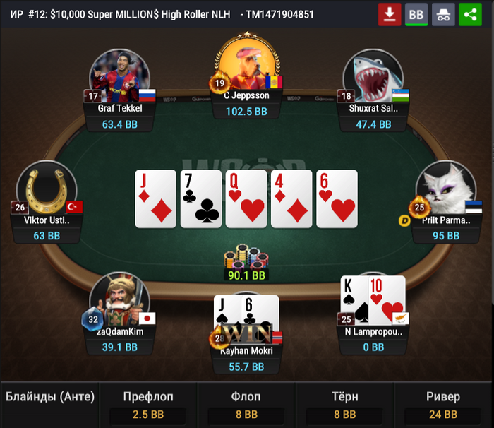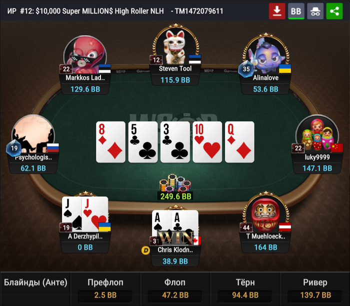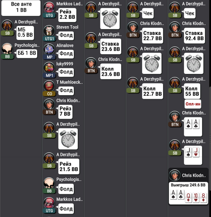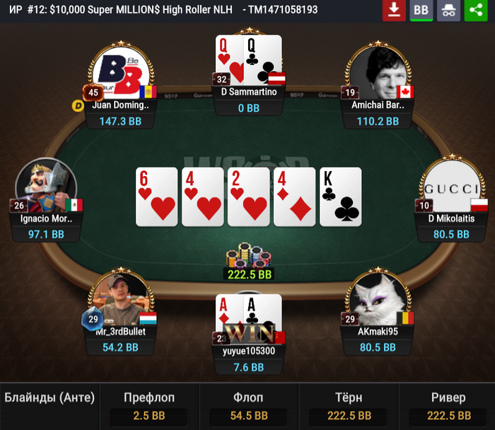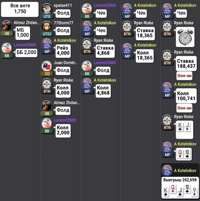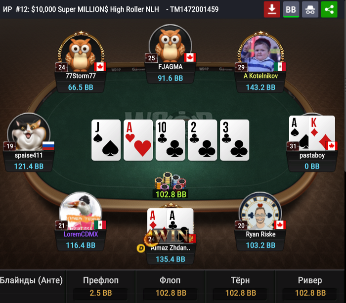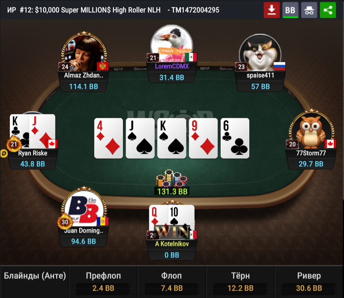 Андрей Котельников удвоился о Райана Риска, собрав стрит, но потом ему же была проиграна префлоп монетка: JJ в АК (туз на ривере).