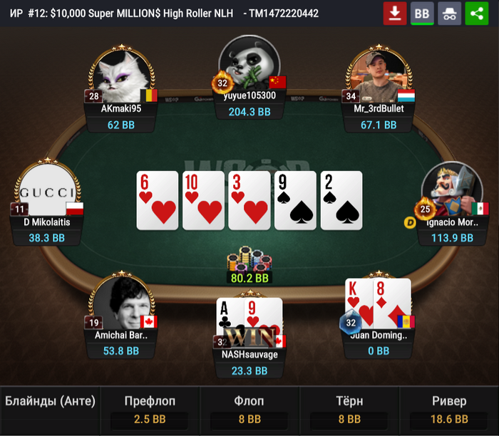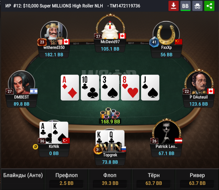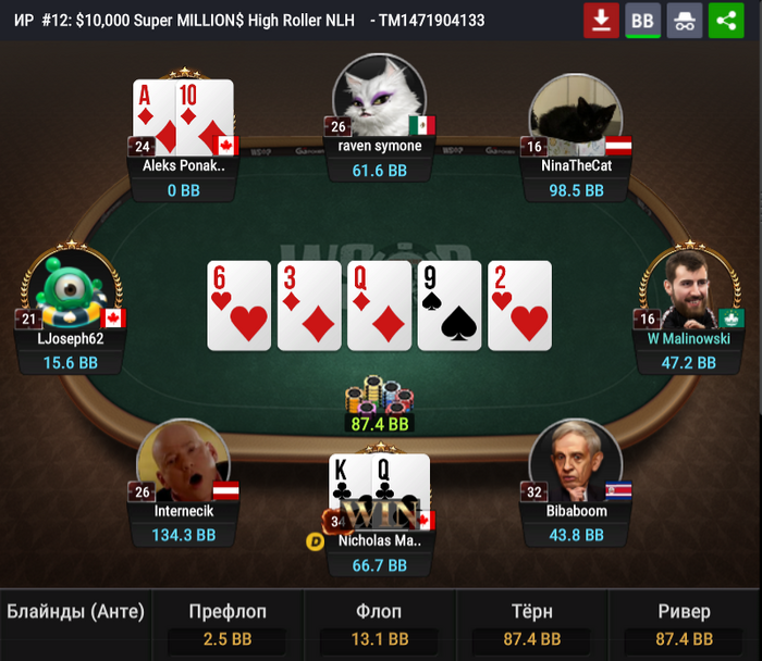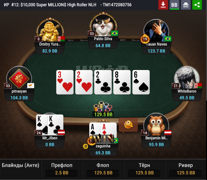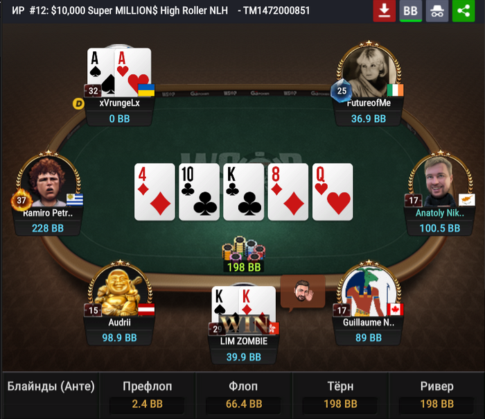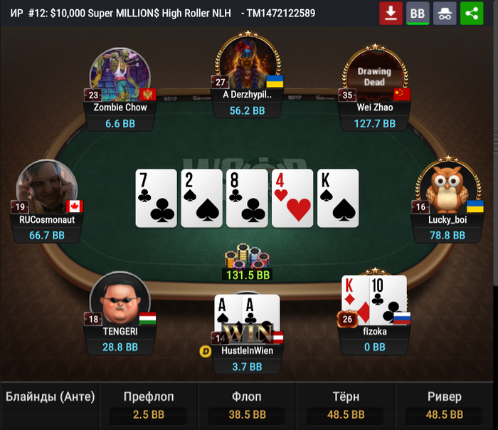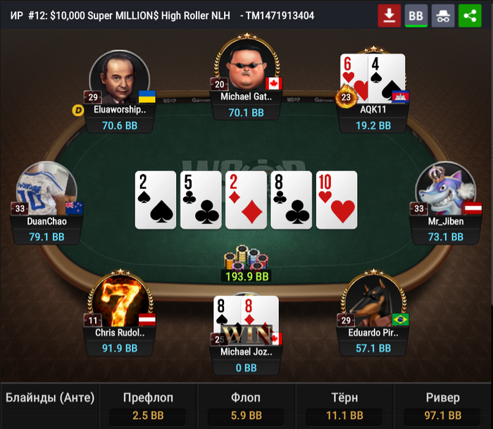 AQK11 защитил большой блайнд и сыграл чек-колл флопа, а потом началось самое интересное: чек-рейз овербета тёрна и олл-ин на ривере! У Майла была слишком сильная комбинация, и он стал вторым в чипкаунте.