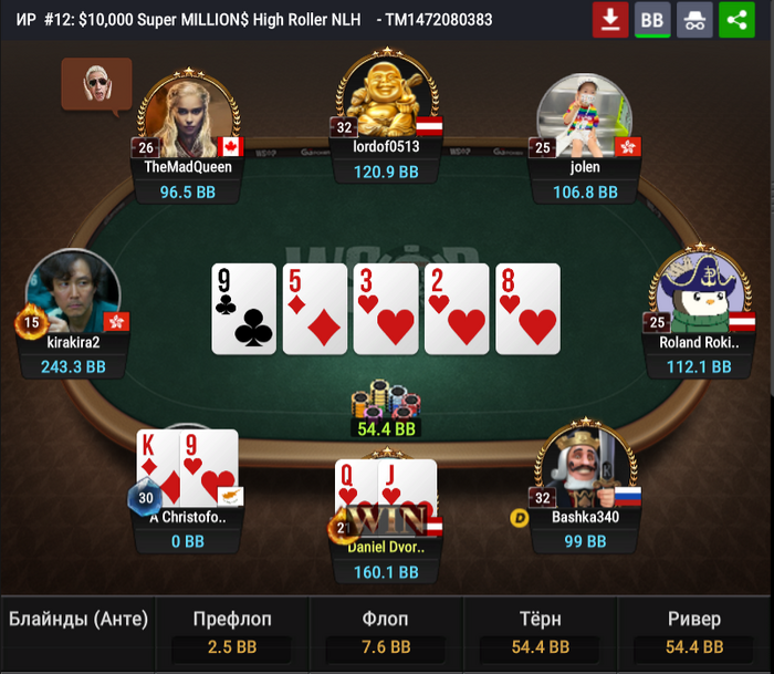 Даниэль Дворесс подколлил на SB после рейза со второй, Христофору защитил большой блайнд. На флопе Дворесс сыграл чек-рейз контбета, а Христофору запушил свои 20 ББ. Дворесс доставил и доехал в раннер-раннер флэш.