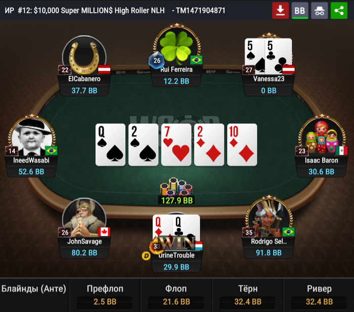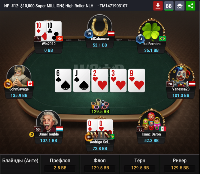 Win2019 сыграл 4-бет пуш с большого блайнда (SB трибетил). Родриго Селуан, сделавший два входа в турнир, поставил свой олл-ин и устоял с дамами.