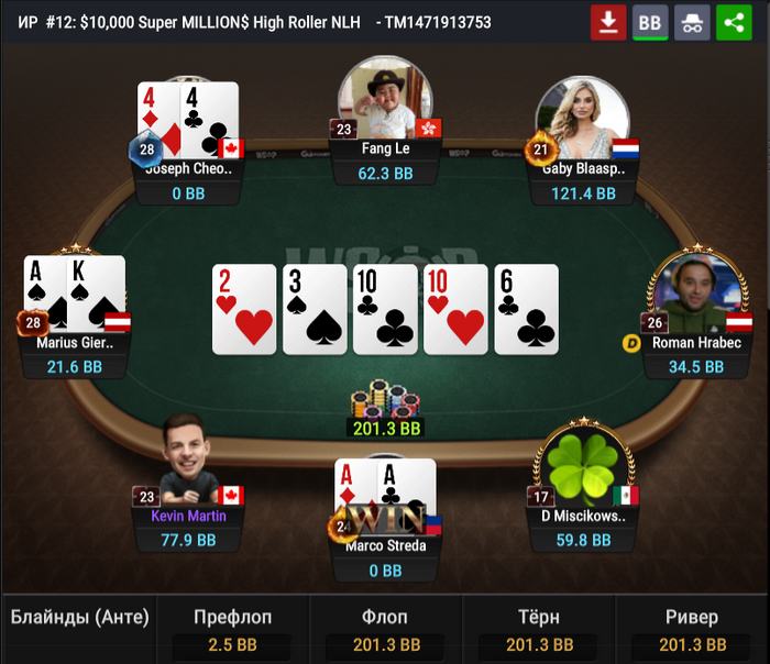 Марко Штреда выиграл тройной олл-ин. Четвёрки там оказались с совсем коротким стеком, а вот у Мариуса Штреда забрал солидную часть стека.