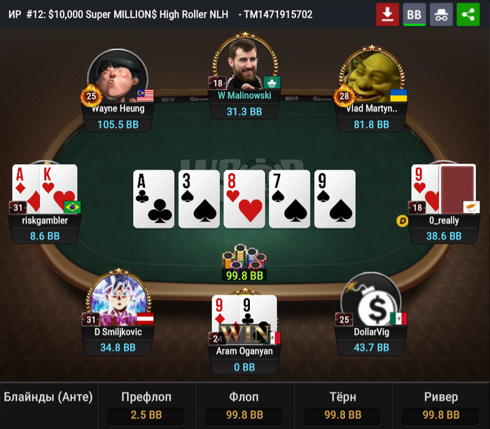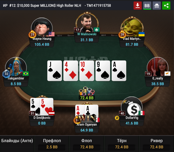Арам Оганян выиграл два олл-ина подряд. Сначала он сыграл сквиз на большом блайнде и заколлировал 4-бет пуш, доехав в один аут на ривере. В следующей раздаче Даниэль Смилькович поставил олл-ин с большого блайнда, и Оганян заколлировал после паса от баттона.