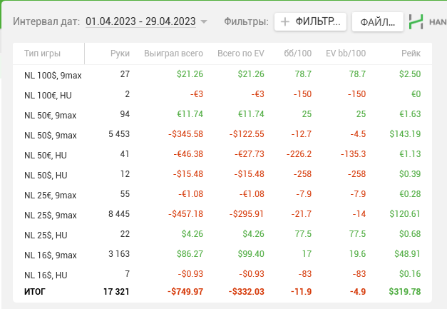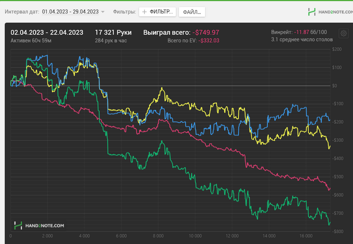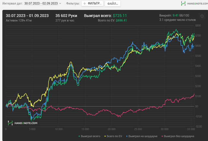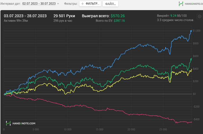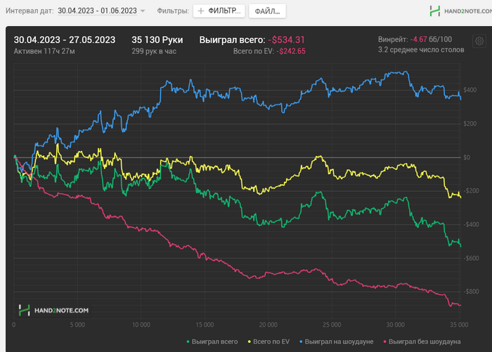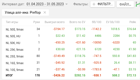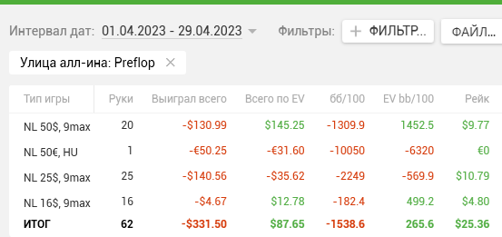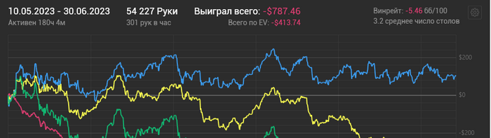 За предыдущих два месяца недобор префлопом был 718$, в этом месяце я прибавил и общая картина - 790$. Хз, когда это закончится).
