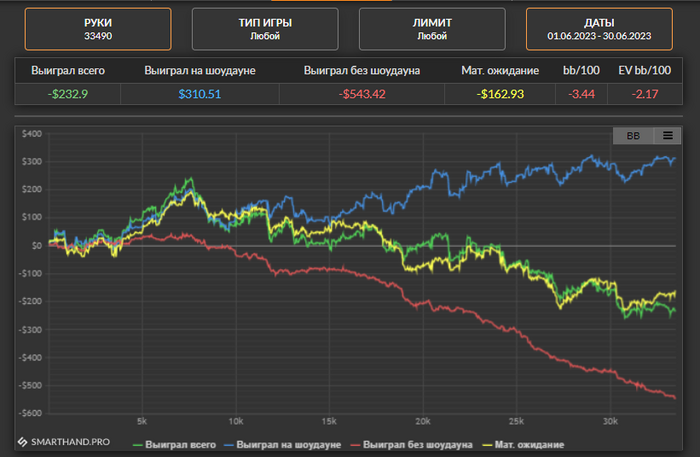 Переигрываю руки, вышел с оверпарой или ТПТК на флоп в 3бет поте, отгружаю его на изи сетам. Тильтую. Ну и конечно сдают пиздец как. Синяя линия за 55к рук замерла на одной отметке. Я просто ни чего не выигрываю на дистанции. Получается взял банк, отдал за несколько раздач. И так по кругу: