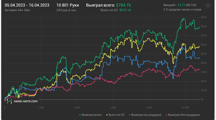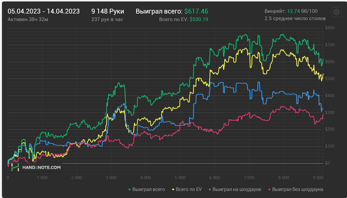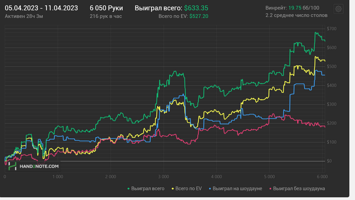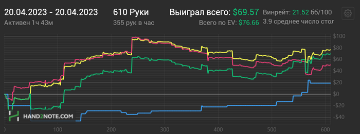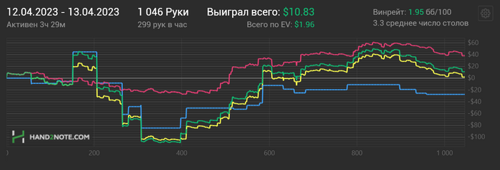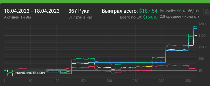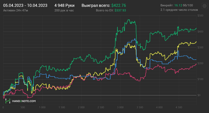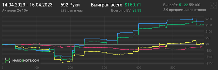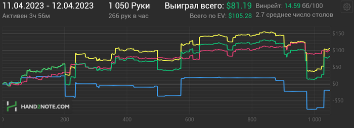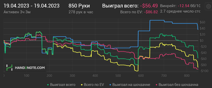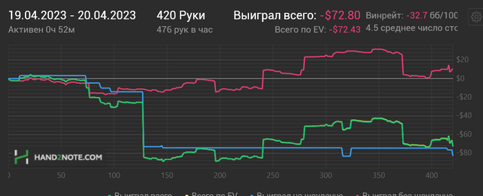 Видимо работа и усталость дают о себе знать, худшая игра по концентрации. В определенный момент вообще думал прервать сессию, думал наделал много ошибок, целых 6 раздач ушло в конфу, но в итоге только одна была с грифом все плохо. Потом ещё наложилось, что много спотом, где выкидывал, хотя после смотря - выкидывать везде и нужно было. Красная сегодня пострадала(( Также в глубоких стеках просто не понимаю, как играть.