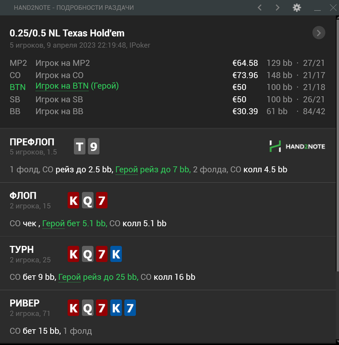 Вчера сильно рубило и хотелось спать из-за этого стандартные 1к не докатал. Сессия паршиво складывалась в плане постфлопа, хотя после разбора ноль ушло в конфу. Ошибка одна, не ту руку я выбрал... -40,5