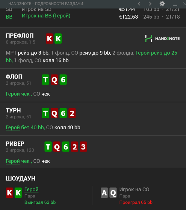 Прям хочу повалить себя. Начало сессии, раздавали хорошо префлоп, на 4 раза KK разными способами проигрывали банки дальше, при этом структуры везде такие, что хотелось "плакать", был близок к своему стоплоссу (при -200 заканчиваю сессию), при это "не поплыл" и показал качественную игру. После разбора было отправлено 4 раздачи в конфу, 2 без ошибки, 2 спорные, очень зависло от оппонента. В ошибки ничего не ушло.