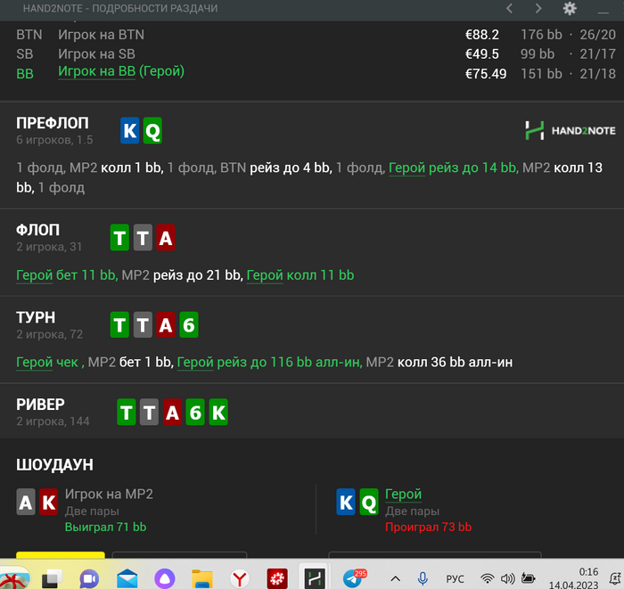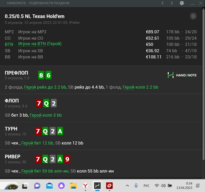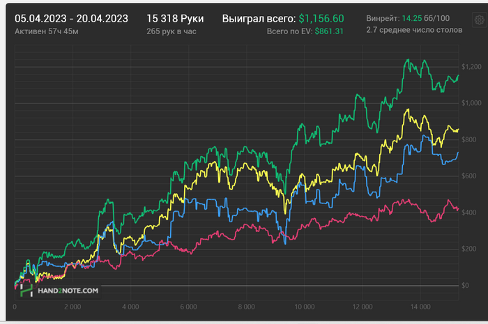 Первые 100 рук недоволен сильно собой, концентрация плохая, трудно оценивать решения, где-то не оптимально сыграл. Потом все ок, несколько кулеров против меня, которые кстати очень сильно помогли собраться. В конце карт дед, ничего не сделать.