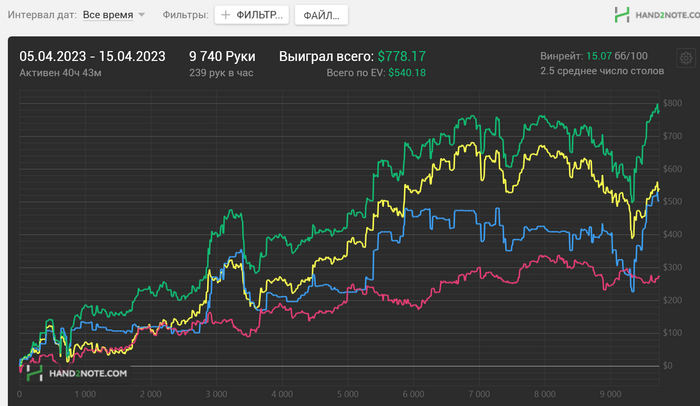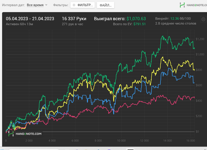 Накатила усталость, через час просто хотелось закрыть столы, и я сделал то, от чего хочу уйти и напомнить себе, зачем я себя дисциплинирую, зачем я пишу это. Ещё раз, 6 - максимум 7 столов, хотелось быстрей откатать, устал, открыл больше и ещё раз... 200000 рук в ноль и в первую очередь из-за большого количества столов (предположительно), пожалуйста помни (6 столов, макс 7!). Ты сразу перестаешь бороться за банки, сразу непонятные решения... После сессии, я не доработал на 20 евро в банках маленьких... Скрин, для памяти, макс 7 столов! Да, это не дало большого минуса сегодня, но это огромный минус на дистанции.