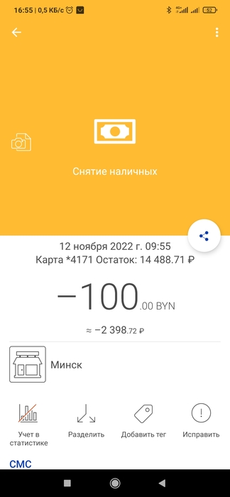 kill1302 @ 14.12.22Не забудьте только о том, что банки могут запросто (обычная практика, сталкивался не раз) спустя 2-3 дня скорректировать на вашей карте сумму снятия, то есть курс, который считался "самым выгодным", легко превратится в "самый плохой". Да и с чего бы вдруг белорусским банкам, дружно исполняющим решение "выдаём 3 бел.рубля за 100 российских", разрешать получать в своих банкоматах (по сути тот же обменник, только автоматический), к примеру, 3,5 рубля за 100?)