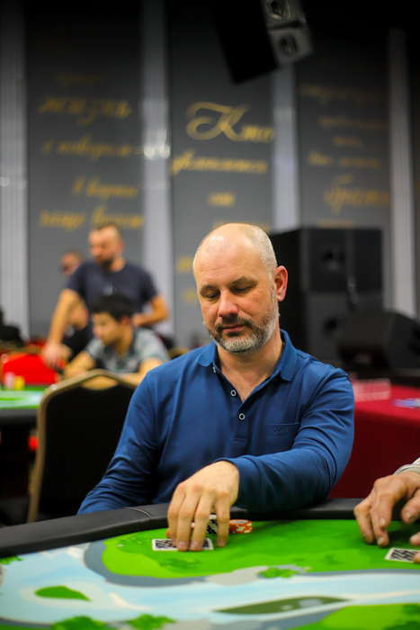 Мезенцев выставляет стэк, Роман - пас. Олег терпит поражение с против карманной пары Александра.