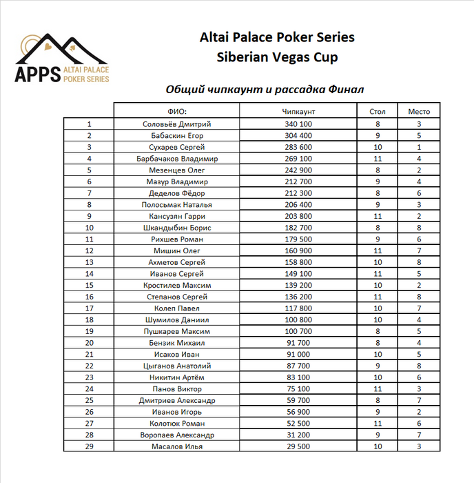 Шумилов Даниил покинул стол 17-ым, а Цыганов Анатолий 16-ый, у обоих 762 у.е. призовых.