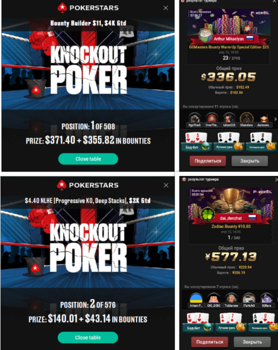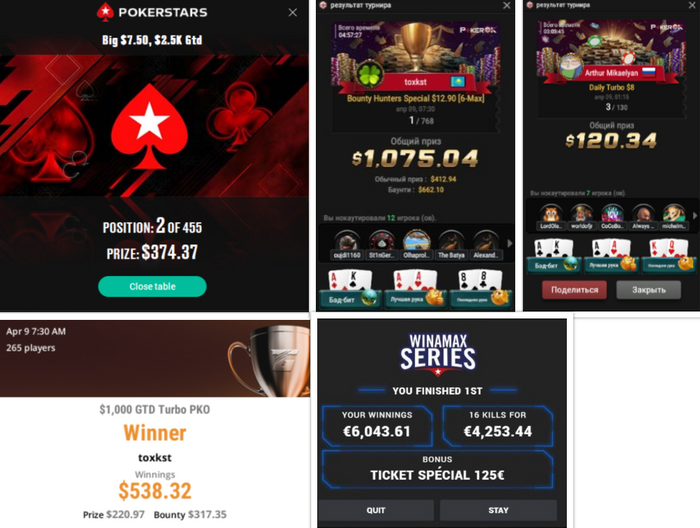 💥@tox (Руслан) становится первым в турнире Bounty Hunters Special за 12,90💲 и получает 1,075💲 а в турнире 1,000💲 GTD Turbo PKO в Тиграх забирает 538💲 так же занимая первое место!!! Отличный результат за выходные в размере 1,613💲