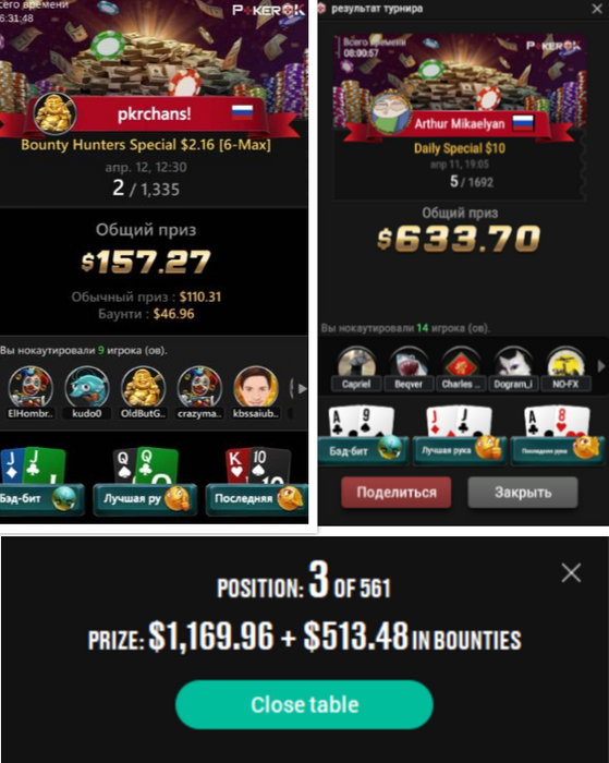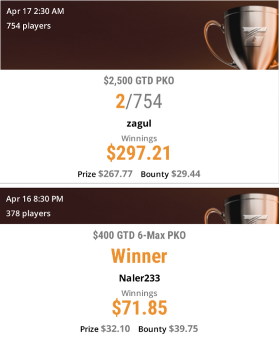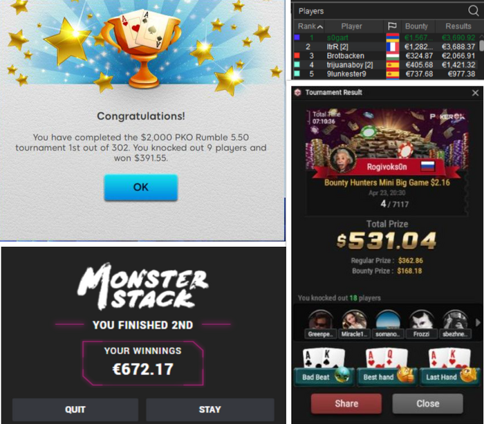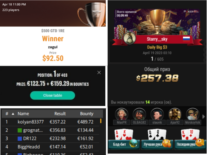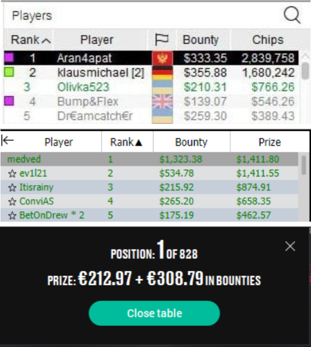 💥Руденок(Александр) принимает участие в нескольких турнирах в первом из них он становится вторым и зарабатывает 211$ во втором турнире PKO- 7,500$ GTD он занимает третье место и зарабатывает 842$ в третьем турнире PKO Rumble за 16,50$ Алекасандр становится первым и зарабатывает 524$