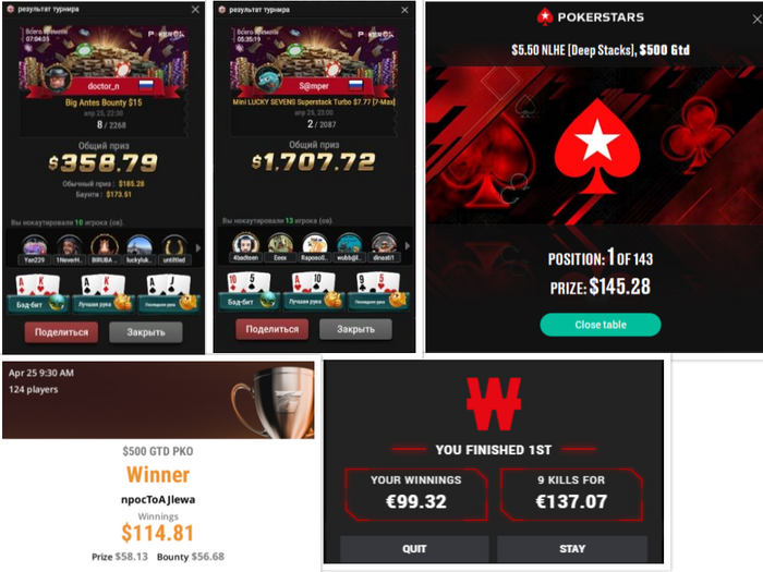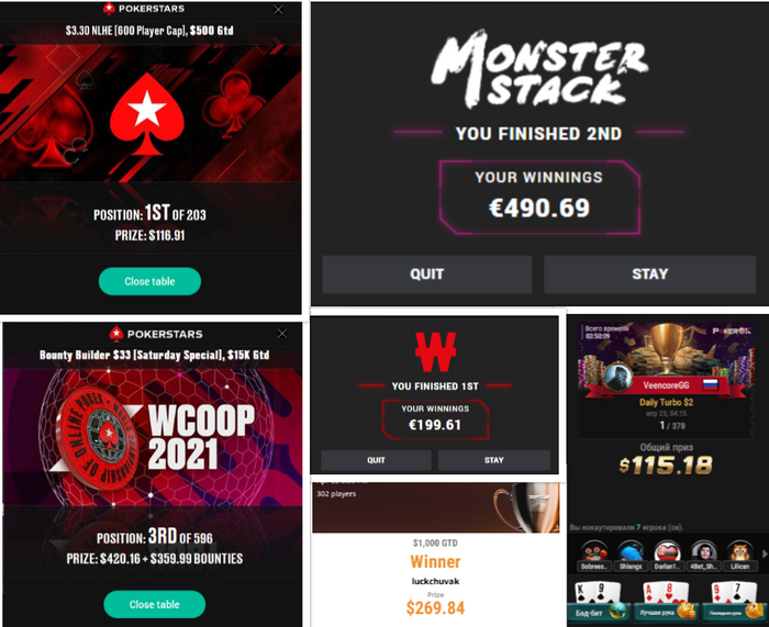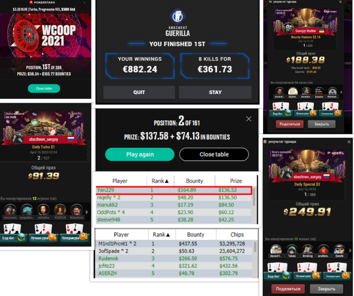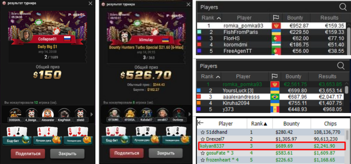 💥sbezhnevs занимает первое место в турнире Daily Special за 3$ и выигрывает приз в размере почти 250$ второй турнир где Сергей занимает второе место это Daily Turbo за 1$ в котором он зарабатывает 91$
