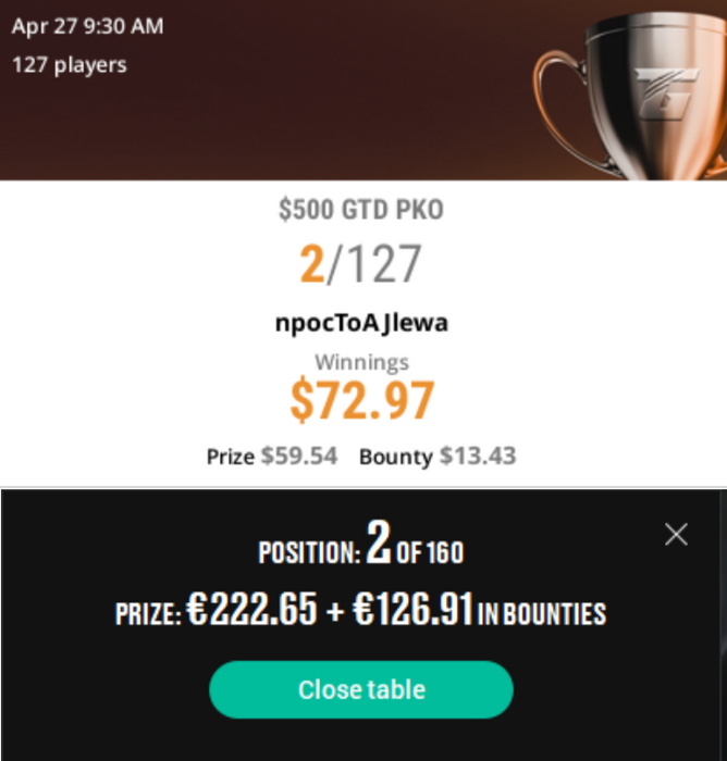 npocTo_aJlewa занимает 2-е место в турнире 500💲 GTD PKO и выигрывает 72.97💲 Поздравляем парней!