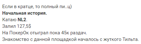 Выиграл во фрилоле 10$. Пробовал кеш, но не получалось. Предпочитал турниры. Играл в сит анд го по 1-2$. Поднялся до 50$. Начался даунстрик. И все залил из-за тильта. Игран не по банкролу. Вот и забросил.