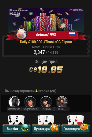 Когда я играл аккуратно, я заметил, что если попадаешь стритом во флеш, флешем в фулхауз и при этом не сливаешь БИ, то билетики на турниры не дают.