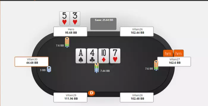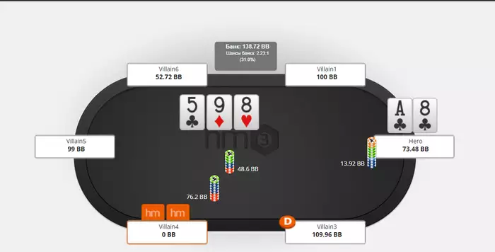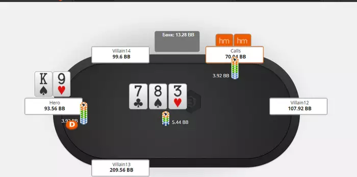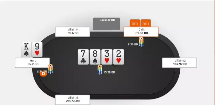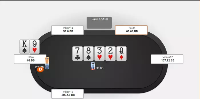 после кола, когда вышла удачная карта и у нас есть супер блокер на лучшую его топ пару ставим снова, сайзом чуть меньше чем 67% чтобы выбить оставшиеся 7х, 3х, А4 А5 и руки типо K10 KJ c фд или без, он фолдит, мы забираем фишки