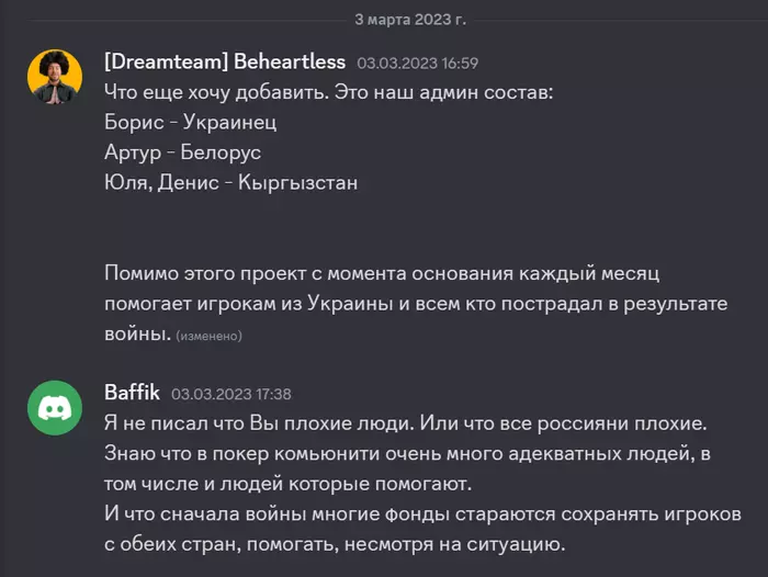“Основная причина, хотя до вступления, я думал что будет норм. Что мне не по душе брать деньги у ребят из Россий, да ещё и сотрудничать долгое время. Хотя я понимаю что многие из Вас уехали, и против всего этого, но осадок всеравно есть((“