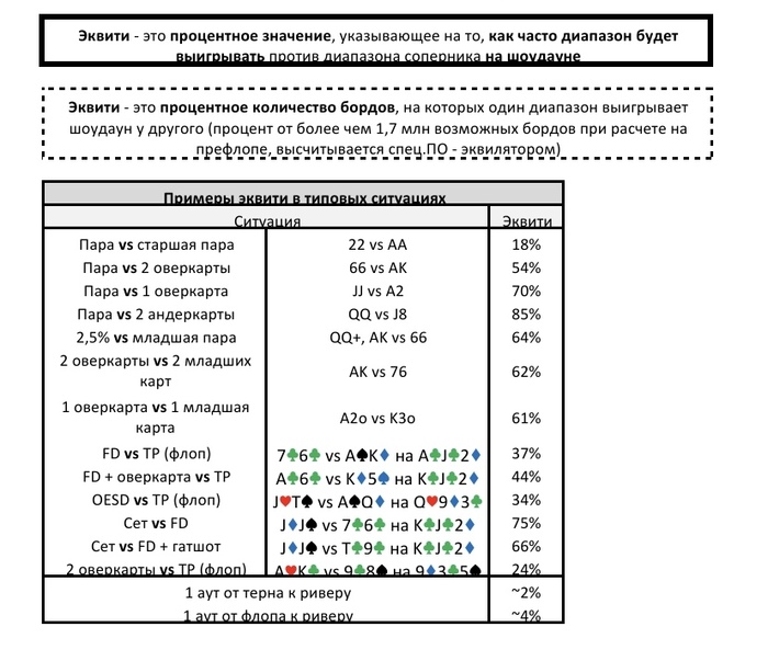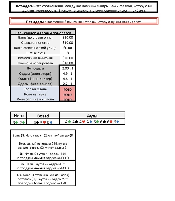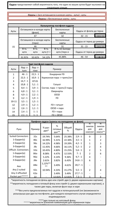 OKCash, ознакомся. Полезное 🤌 А лучше выучить на изусть! Там и про то что я говорил, что порой достаточно 1 из 10 раз выиграть, чтобы был выгодный колл на ривере на дистанции. Остальное позже, докику, еали нужно будет, просто пытайся первое время придерживаться префлопа и таблице постфлоп. Если ты это не способен сделать, то в покере нет смысла тратить время, точней как хобби, можно, но как заработак рассматривать нет смысла.