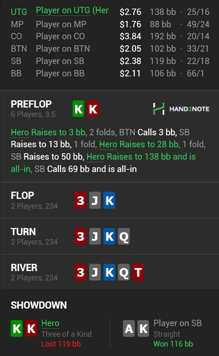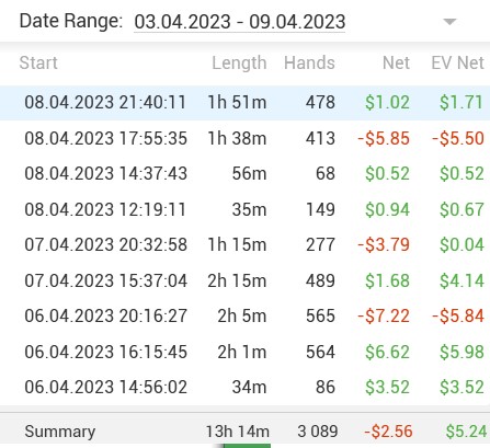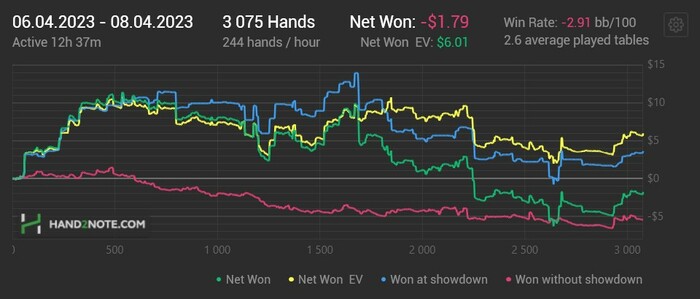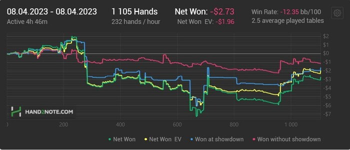 Бывают дни, когда тебе вроде хорошо заходит, и ты неплохо попадаешь в доски, но твоему оппоненту заходит ещё лучше. Вот сегодня именно такой день. Можно было проиграть меньше, если бы я верил оппам и не делал глупые ошибки. Когда пересматриваю раздачи, то понимаю, что надо было сыграть по-другому, но во время игры мне, видимо, не хватаем времени чтобы хорошо обдумать действия, или же я просто не вижу всей картины (ведь когда уже знаешь, какая рука была у оппа, тогда и понимаешь, что надо было сыграть по другому).