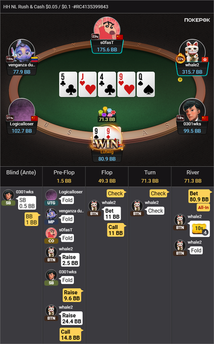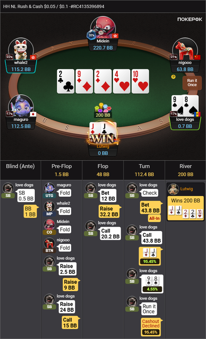 2. Тут, честно говоря, я не нашел велью рук, которые так хотят играть кроме топ-пар. Но и тогда непонятно почему они не пушат. Забайтился на кривую линию. Близко было к отморозу - надо будет посчитать разобрать раздачку.