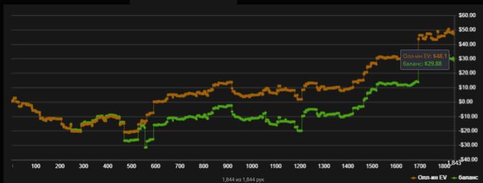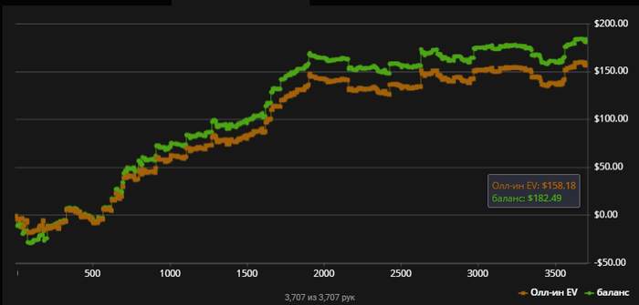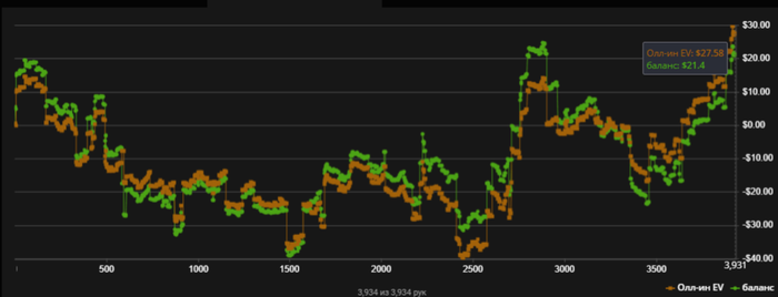 4) Общий результат на NL10 Rush. (с учетом того, что стартанул на 1.5 часа раньше банкролл-челленджа - лень убирать руками сессии, к тому же график повнушительнее выглядит так)